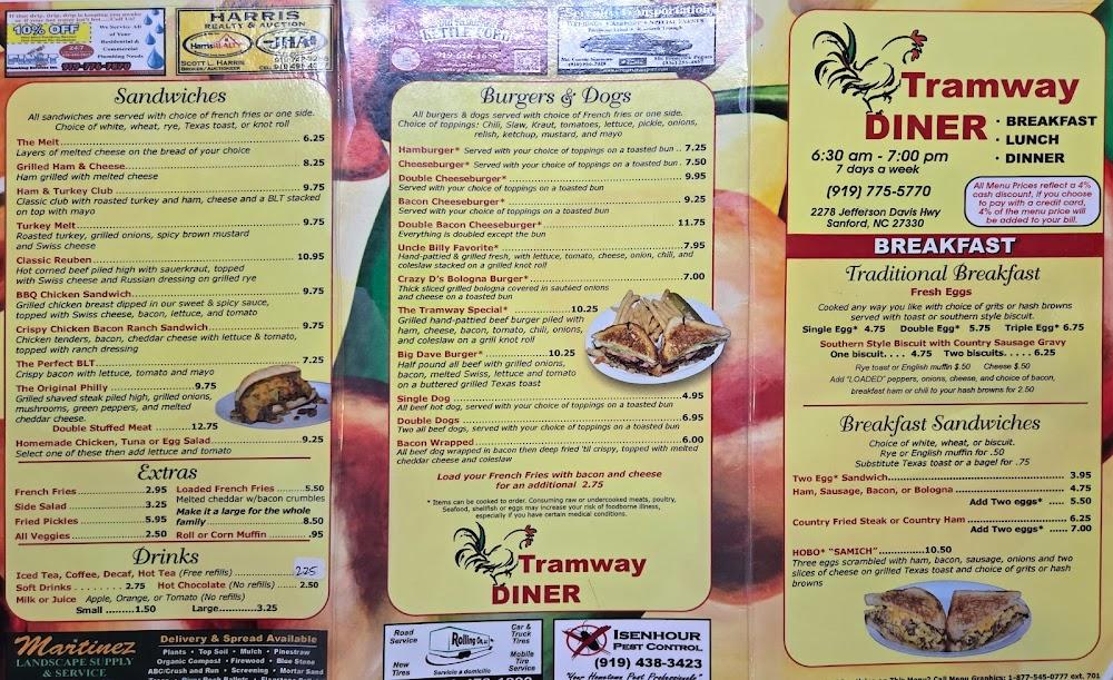 Welcome to Tramway Diner, your home away from home in Sanford, NC! A family-owned haven for those seeking affordable, delicious home-style cooking, we serve breakfast, lunch, and dinner all day long. With a cozy, family-friendly atmosphere, you'll feel right at ease whether you're dining solo or with loved ones. Enjoy our excellent coffee, desserts, and a wide selection of teas, while indulging in local specialties. Our diner is fully accessible and offers takeout, delivery, and a private dining room for special gatherings. Come visit us at 2278 Jefferson Davis Hwy—we can’t wait to serve you!